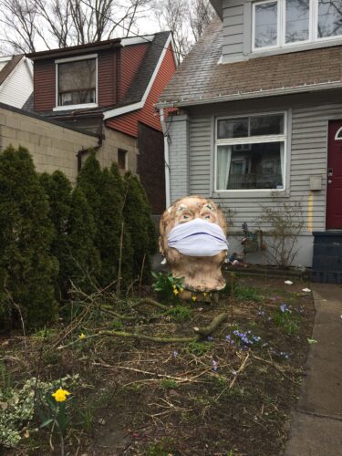 Passersby mostly pass her by, consider: trinket, tchotchke, trifle, toy (Made in China, natch). Grieved or grieving – lost or Lysol curbside pick-up (“free to good home”)