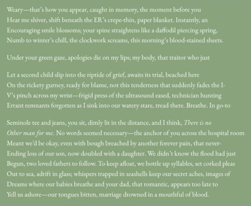 “In 2017, I began writing song-inspired poems for a collection entitled Certain Songs, exploring the relationship between music and memories to create pieces, much like ekphrastic works derive inspiration from visual art. The collection itself was inspired by the song of that name by The Hold Steady, specifically Craig Finn’s lyric, ‘Certain songs—they get so scratched into our souls.’ As an organizing thread, all of the poems in this series are acrostics that spell out the song titles that sparked the pieces, and the titles are fragments of the song lyrics. ‘It’s Hard to Think about Anything but to Breathe’ was written in response to ‘When U Love Somebody’ by Fruit Bats.”