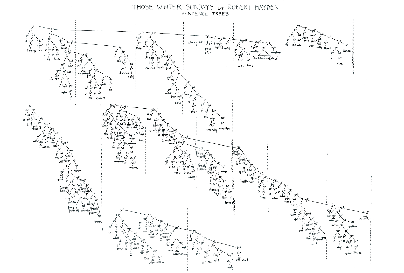 “The final poem is what ‘Those Winter Sundays’ would sound like if you were to read the ends of each branch of the X-bar diagram, moving top to bottom and left to right. This reading voices parts of the sentence that you don’t normally hear, including all the null elements, tense phrases, and traces of words that have moved to different positions.”
