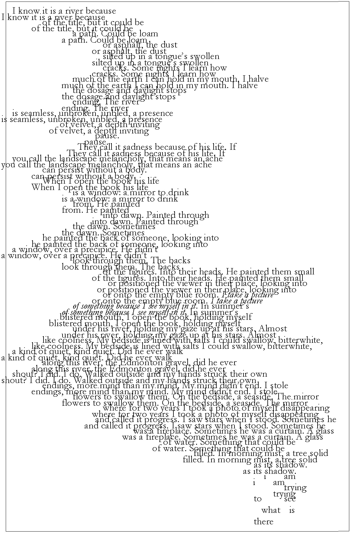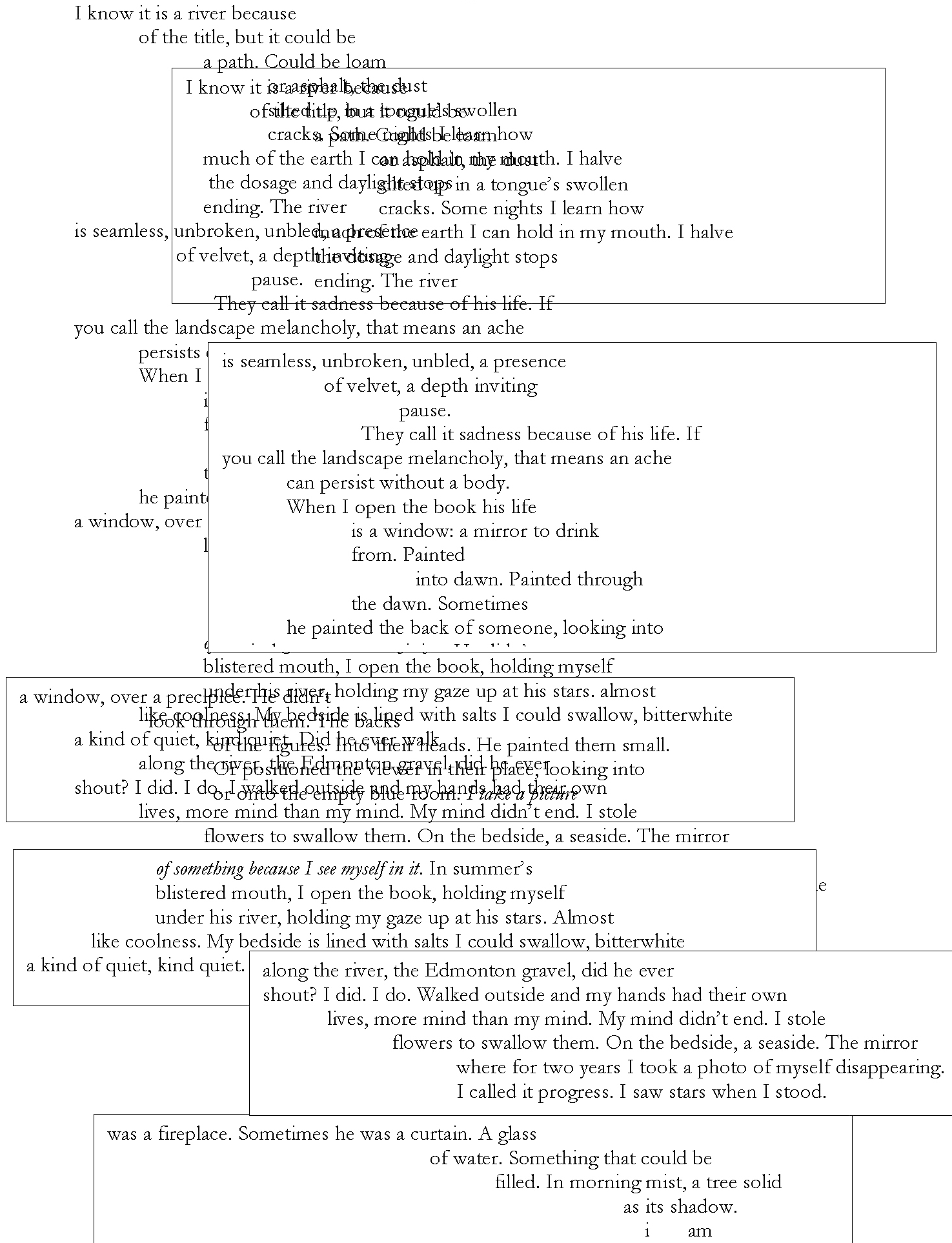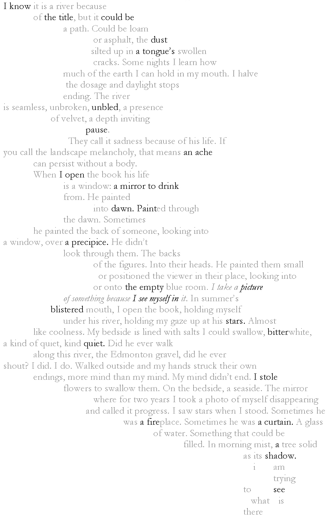 “I am also indebted to Adam Haiun’s textual experimentation in his poetry collection I Am Looking For You In The No-Place Grid (Coach House Books, 2025) and to Misha Solomon for his generative prompt.”