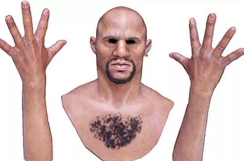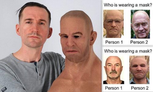 “19: At left: Dr. Rob Jenkins of the University of York holding a silicone mask (photograph by Paul Shields). At right: what I would assume are examples of the test material used in Jenkins’s research (masks again by Real Flesh Masks). In 2019, Dr. Jenkins co-authored the paper, ‘Hyper-realistic face masks: a new challenge in person identification,’ which noted a staggering lack of ability on the part of many participants involved to discern between actual human faces and silicone facsimiles, either in photographs or when presented with real-life masked individuals. With the rapid advance of mask technology over the last half-decade, one suspects our acuity has failed to keep pace with these meagre rates.”