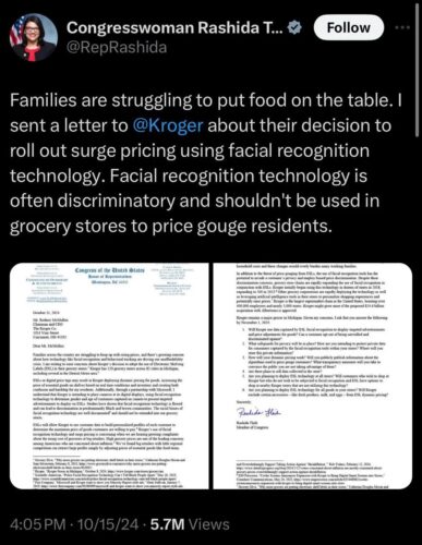 “20: A screenshot of a 2024 Tweet published by Congresswoman Rashida Tlaib, including the letter she sent to Kroger Chair and CEO, Rodney McMullen, regarding his grocery firm’s existing use of facial recognition cameras in-store in conjunction with their decision to adopt the use of Electronic Shelving Labels. Congresswoman Tlaib’s concern (and the Electronic Privacy Information Centre’s concern) is that such systems will facilitate surge pricing on the front-end, and may impact back-end factors to do with consumer choices. I.e., if you purchase ‘unhealthy’ foods, your insurance rates and access to healthcare may be negatively affected. Current laws in the US and Canada remain ambiguous about the wearing of identity-obscuring masks while doing the weekly shopping, but given the rise of flash mob robberies (a 2023 article by Allie Falk for, Loss Prevention Magazine, quotes a National Retail Federation statistic that flash mob robberies now account for a $700,000 loss for every $1 billion in sales) it’s conceivable that such practices will see prohibitive legislation in years to come.