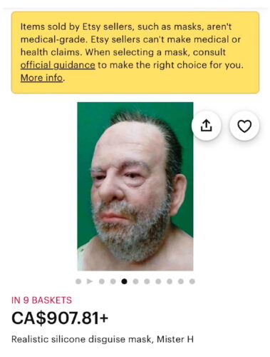 “Advertised with a total absence of concision, the “Personalized Face Mask Add Your Face Photo Halloween Face Mask Customized Bandana Face Mask Reusable Funny Fraud Mask” does manage to eventually indicate the item may be used for fun or fraud. Not unlike many technological innovations—one thinks of the gunpowder used for fireworks prior to it becoming the essential component of the menacing fire lance—this is apparently intended primarily for amusement. However, it’s probable we are more familiar with such items having read news reports of crime involving disguises.