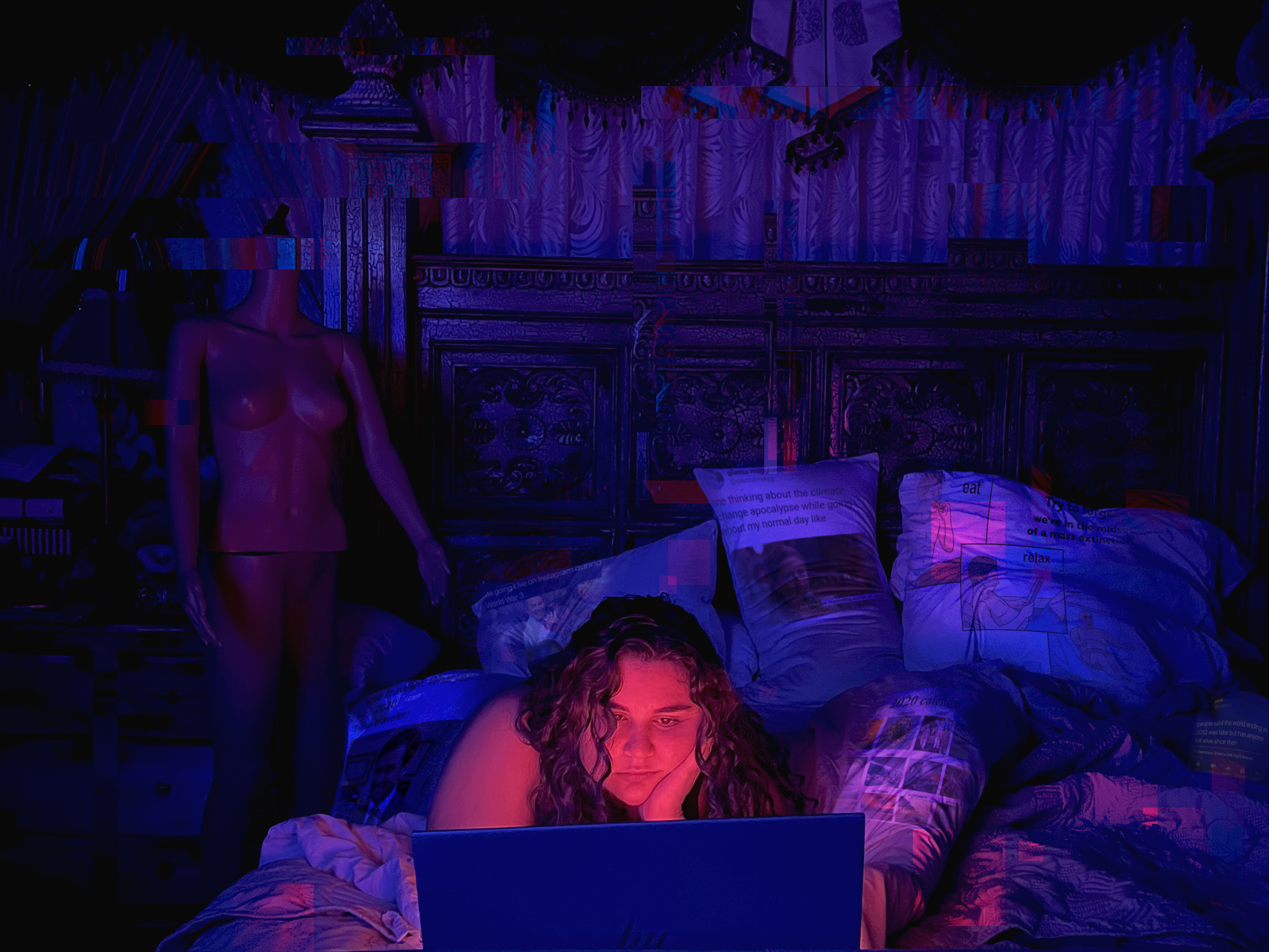 “This work peels back the virtual curtain, reclaiming human agency in a world where we are seemingly powerless, by having myself as the central figure. It blurs the lines between virtual and physical reality through ‘glitches,’ meme overlays across the bed, and a simulated ‘clickbait’ woman’s body—a nude, dehumanized mannequin. It was born from my struggle of being disabled in the COVID-19 pandemic; isolation compounded on itself, the doom-scroll. It also reflects the ways I look for humor and information online as a queer, Latina woman who’s losing my rights. The red is a paradox, both a blistering red warning, something that is dangerous, leading to disinformation and fear—yet it doubles as warmth, and community, in an otherwise cold and isolating world.”