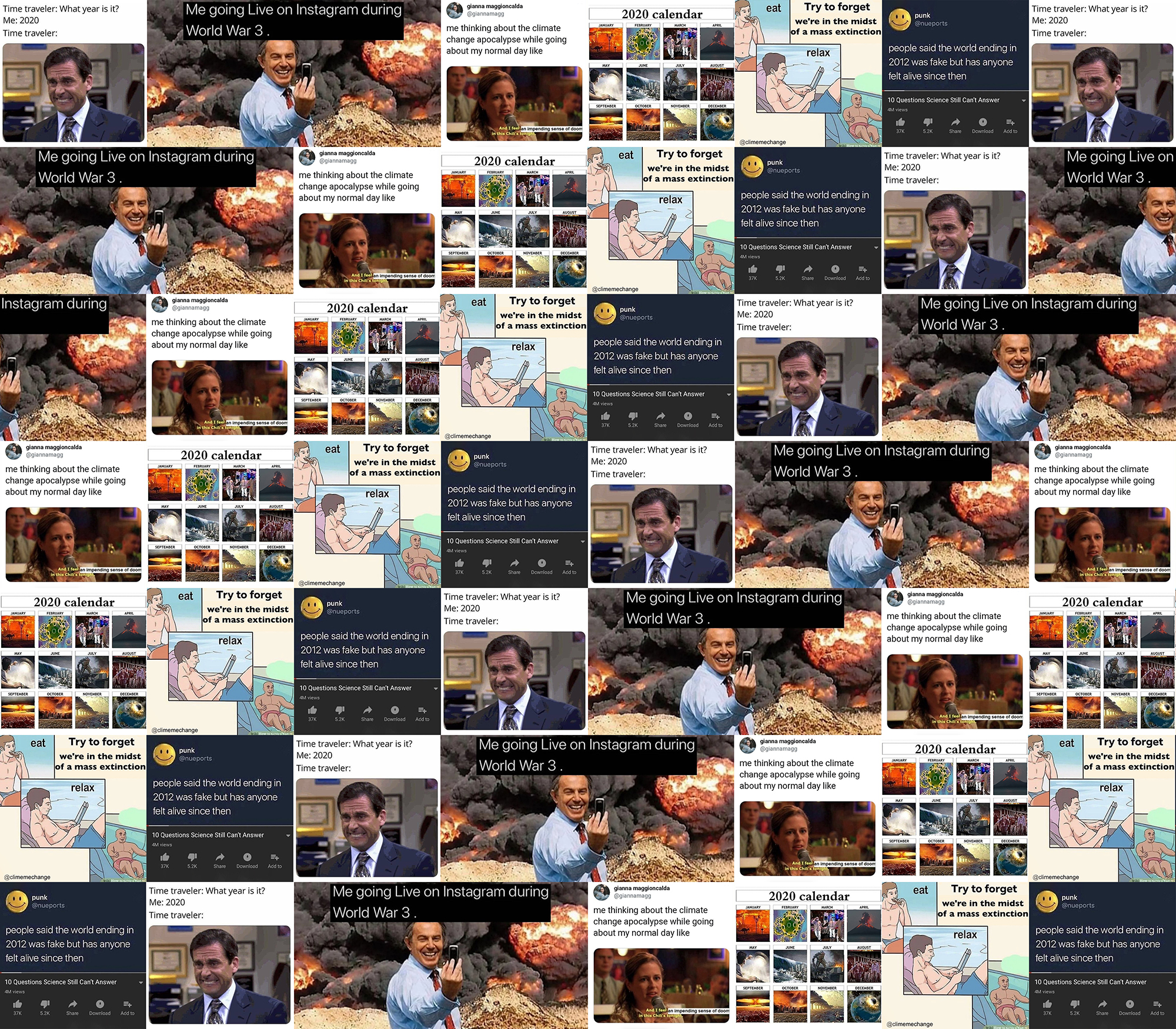 “What else can we do but look at the looming apocalypse and laugh? The World’s Ending, but at Least We Have Memes reflects on the humorous deflection of existential dread and the incoming apocalypse(s) through memes.