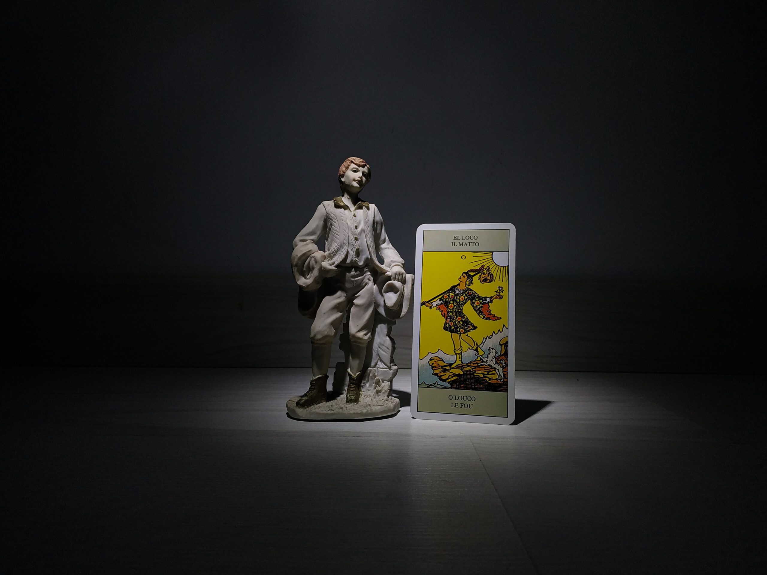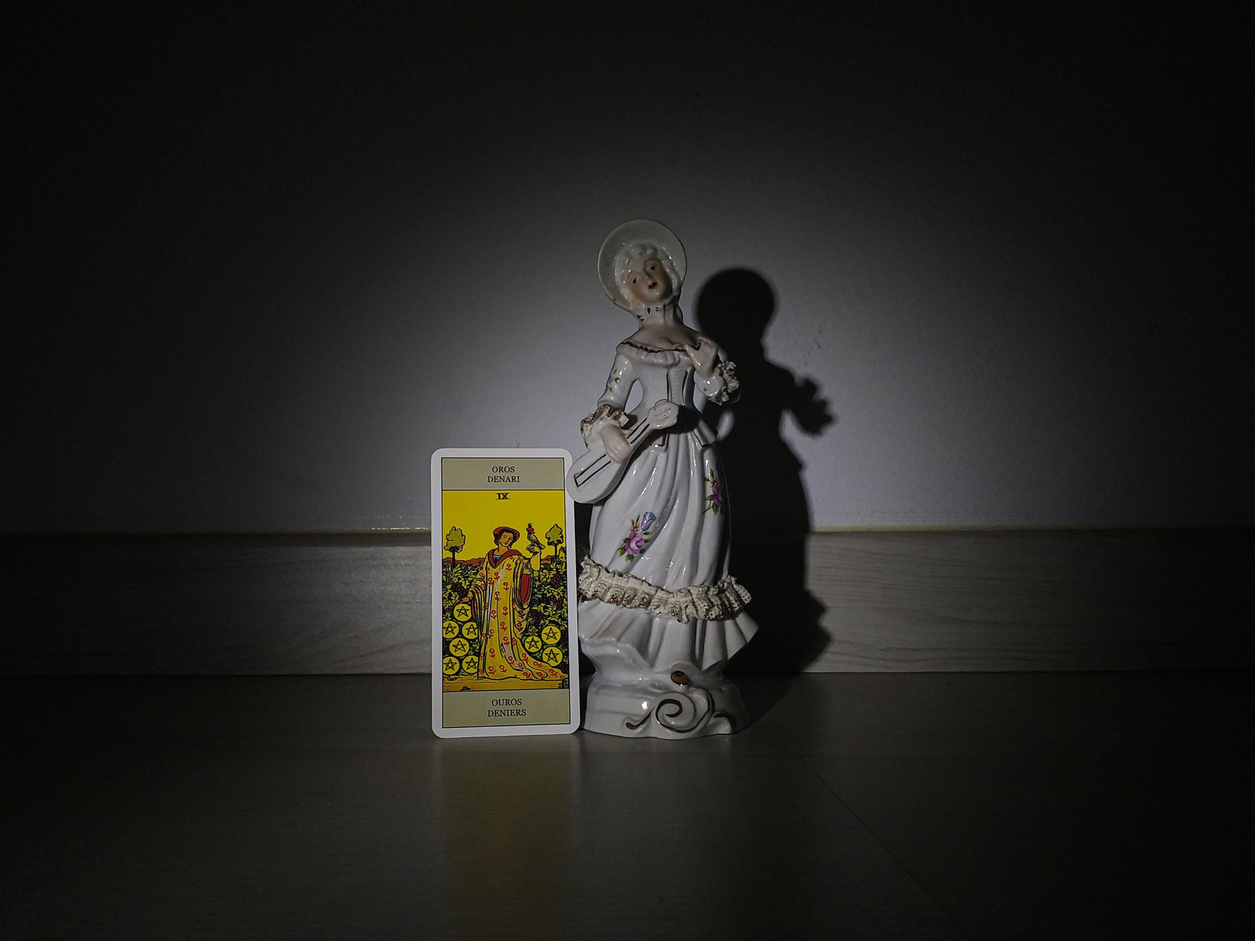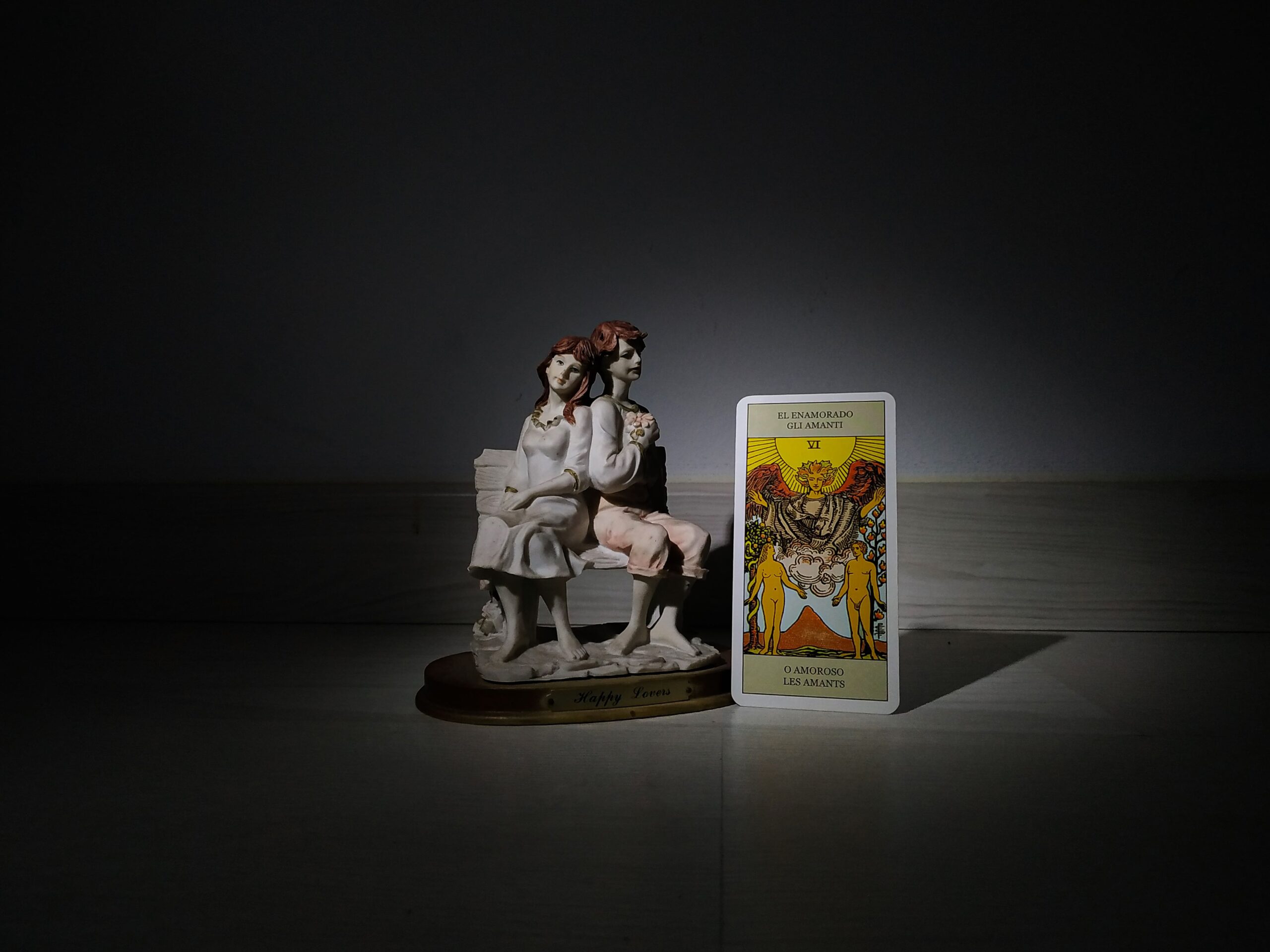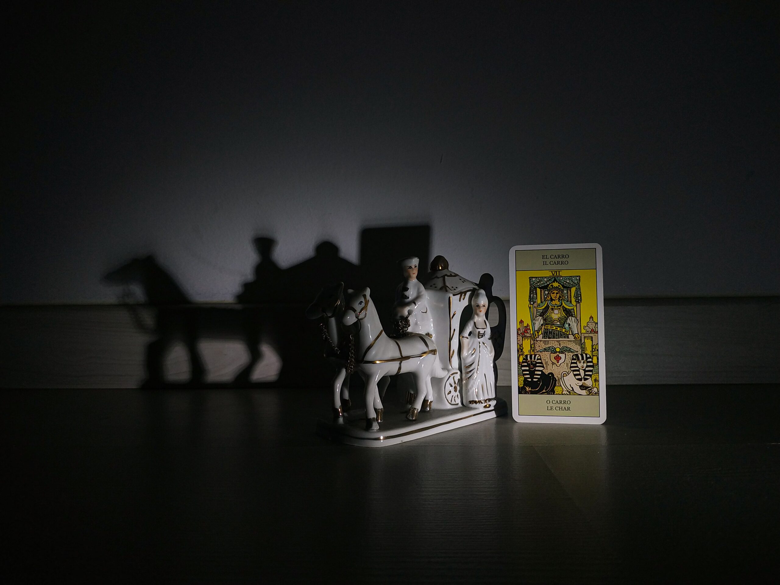 “I have a special interest in symbols and allegorical images. Tarot imagery, as such, becomes an inspiration for many of my works. In this work, I took the Rider-Waite-Smith tarot deck (1909), with drawings by Pamela Colman Smith, and associated some of its cards to small statuary I had in my home. The idea of playing with dimensional images is really interesting to me, especially the movement of bringing a two-dimensional image to three dimensions. The figure leaves its frame, as if it were coming alive. My project is, then, a direct response to the images of the tarot, connecting them even more to the physical world. Their symbolism made manifest.“