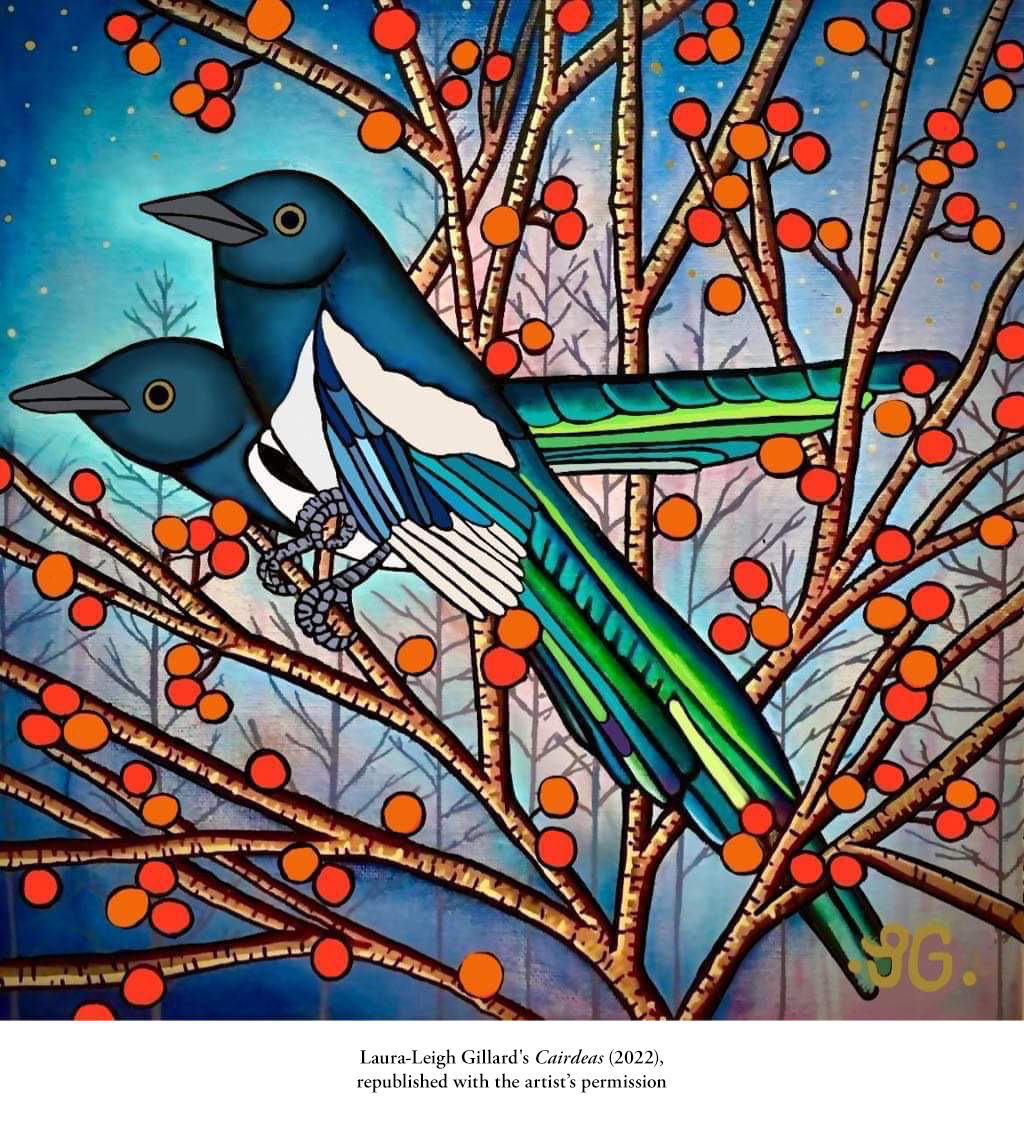 “This poem is based on a painting by Laura-Leigh Gillard, a visual artist who lives in Copper Cliff, Ontario. She titled her piece Cairdeas (2022), which is an Irish word that means ‘friendship’ or ‘kinship.’ I am responding to that prompt, of two magpies that symbolize two friends, and weaving in a visit to British Columbia. Seeing orcas off the west coast of Vancouver Island is as dear and rare as finding a very good friend who will stand by you in the hardest of times. ‘Cairdeas’ the poem is a sonnet but not in a formal, traditional way. The poem is a birthday gift for my friend, Laura-Leigh, who offered me her painting as a gift earlier this year.”