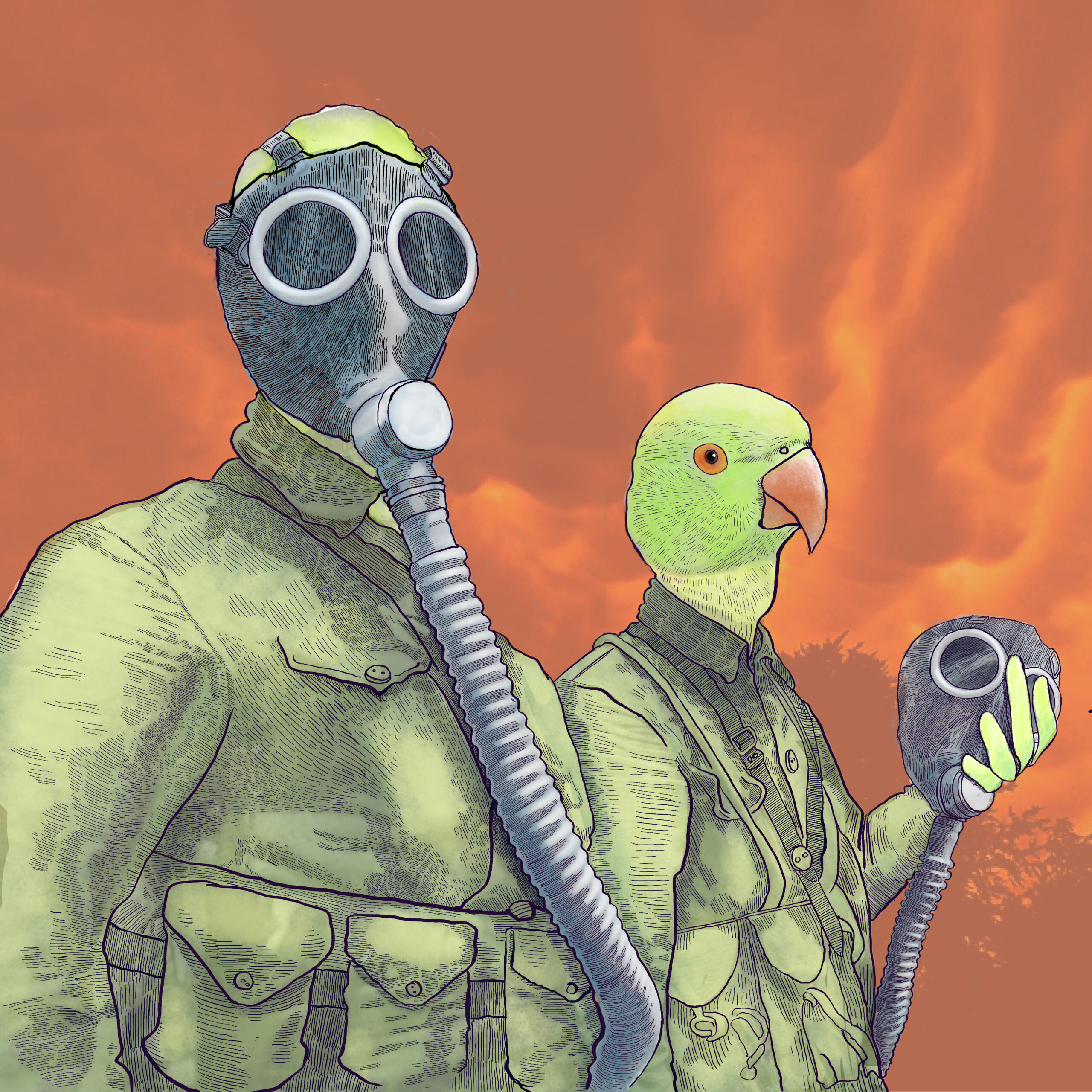 Rich Janney was born to draw parakeets with gas masks, in Omaha, USA, and with a pen and parakeet gas mask in hand. Rich drew said parakeet gas masks shortly thereafter.