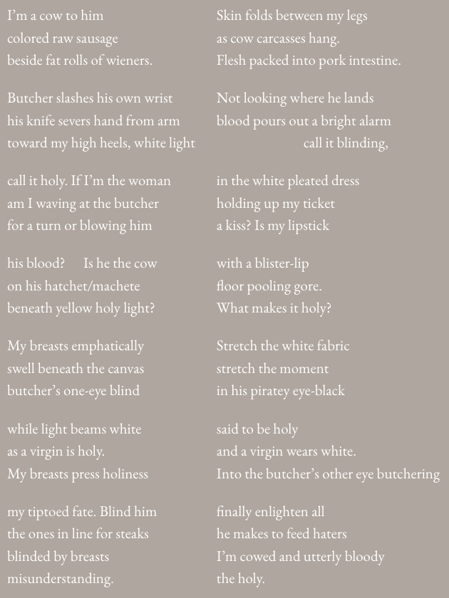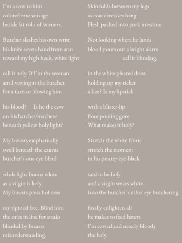 “I saw Rose Wylie’s Pink Pig and Sausages, Homage to Retablos painting (2020) at a gallery in New York City in 2022. I love the way Wylie provides a narrative for the viewer—including the line ‘the butcher turned his head to look at my legs’ painted across the piece—which I felt compelled to explore as a series of clues: what she puts on display, how what is painted is objectified, and what that feels like.”