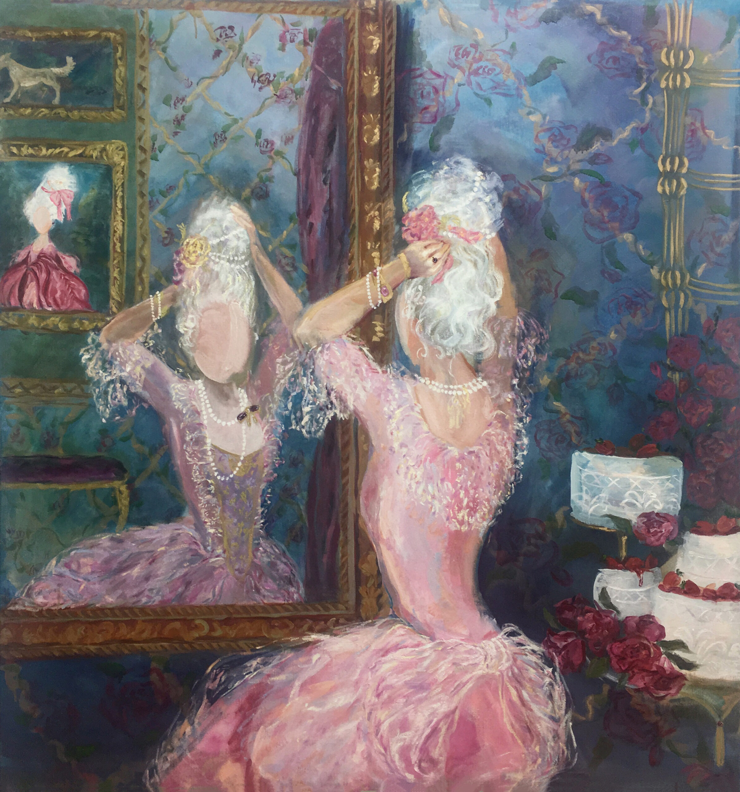 “Replacing the angel from Diego Velázquez’s Rokeby Venus (1647-51) with the black cat from Édouard Manet’s Olympia (1863) adds a bit of playfulness and mystery to Who’s the Fairest of Them All, while the mirror’s emptiness and darkness suggests loneliness, tension, and a sense of danger. The space is private but inviting, and the woman’s face is blurred, inviting viewers to project themselves onto her. The painting is also a portrait of my fantasy self. The Baroque is a much maligned style, but it’s underpinned by idealization, hope, and dream.”