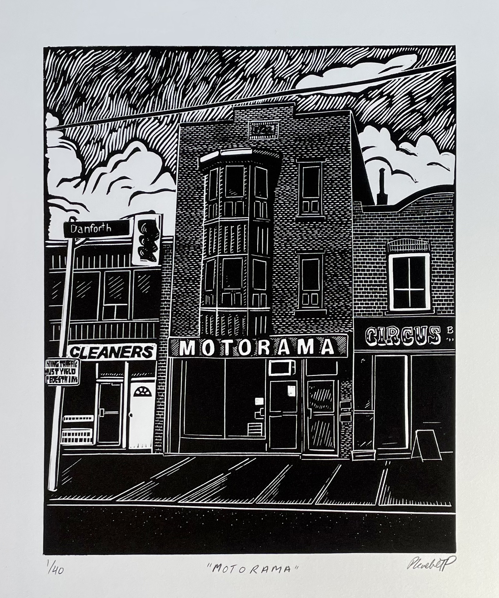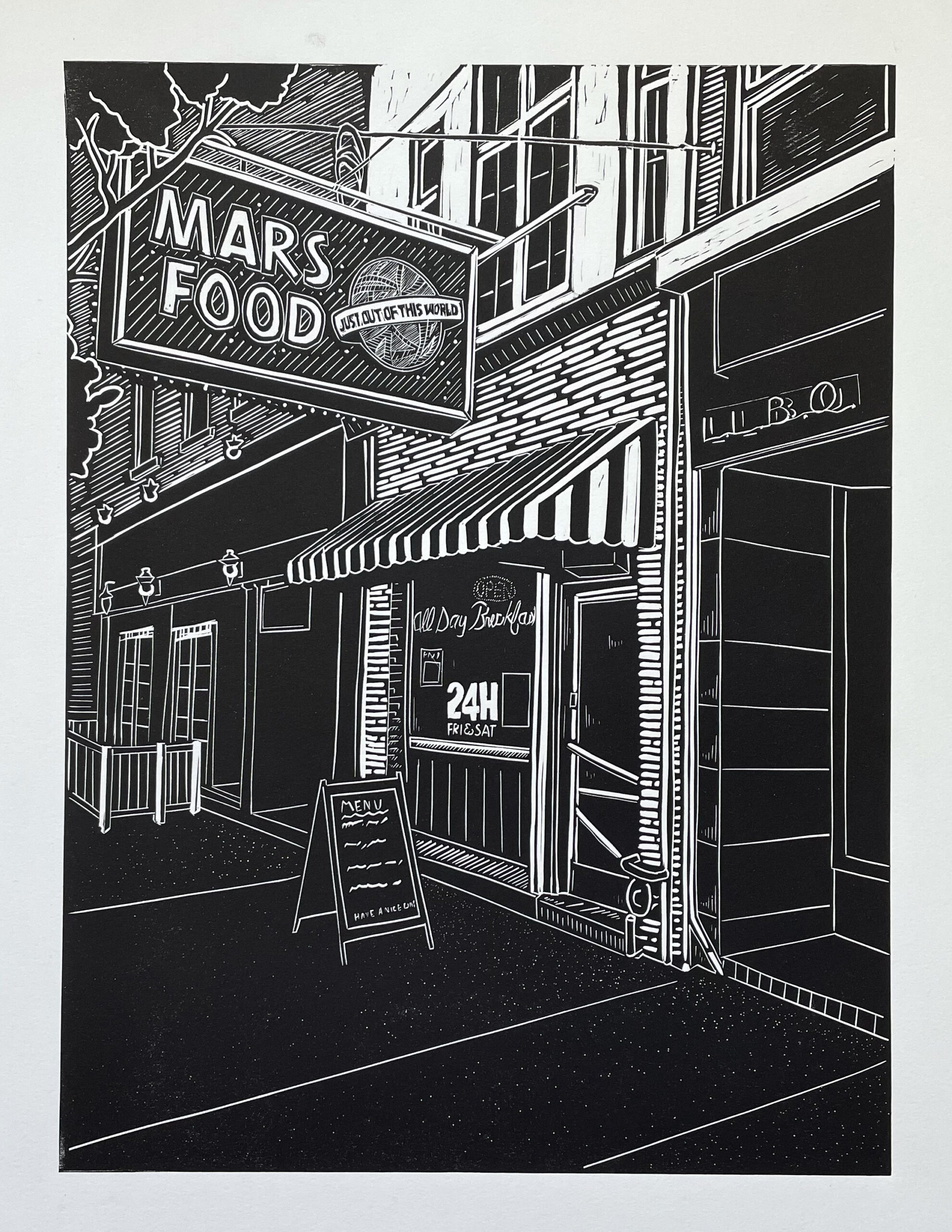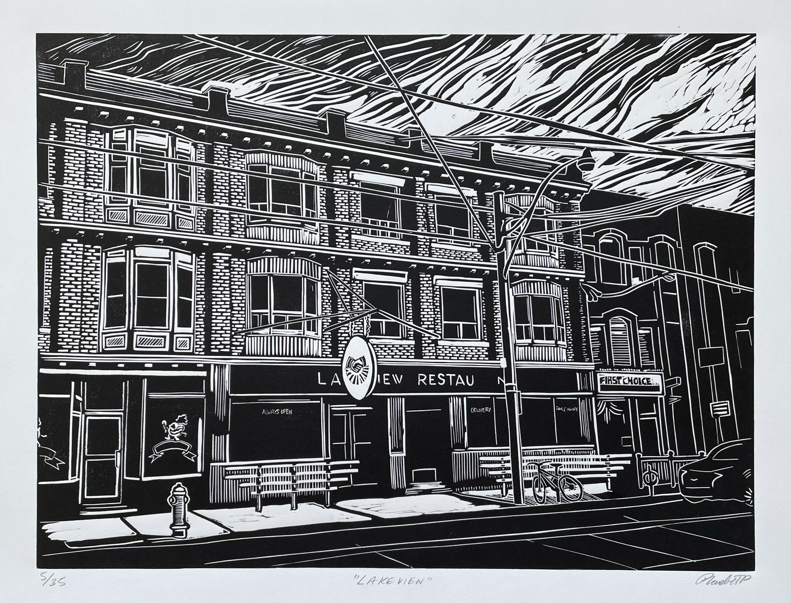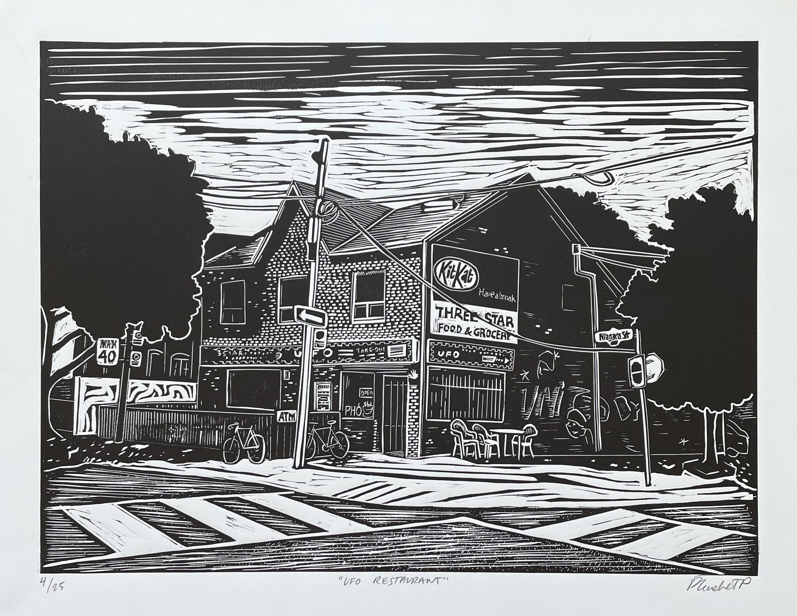 “This series of linocut prints respond to the architecture and design of diners in my city: Toronto, Canada. I began this series when I realized the ubiquitity of certain features in a diner, which actually stem from their origins in the late 1800s as the first mobile restaurants, which later morphed into pre-fabricated restaurants. This is why the inside of a classic diner always has the recognizable counter, behind which is the flattop grill, and on the opposite side the row of vinyl-and-chrome stools. However similar these places are on the inside, however, the outside design and architecture of the buildings that they inhabit are always unique. Because diners that serve affordable food at (in pre-pandemic times) all hours of the day are getting pushed out of the city by skyrocketing rent prices, demolished by condos or replaced by cannabis shops, I felt it was important to continue to document these establishments, many of which have been there for decades.”